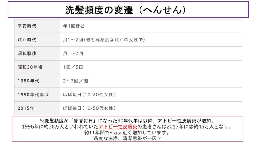 高度経済成長期を経て、とくに1990年代以降は「毎日洗う=清潔」という価値観が強く広まりました。